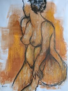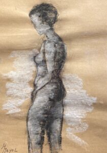 Après des études d’histoire de l’art à la faculté de Toulouse Hélène Mayol fréquente des ateliers de modèles vivants. Elle travaille beaucoup le graphisme et la matière : pigments, enduits, feuilles d’or… De ce fait ses toiles ont du relief, des traces, des ombres et des lumières. Elle utilise des teintes très chaudes, en particulier les rouges et orangés. Elle aime les formes et peint les corps et les objets aux contours pleins et harmonieux.